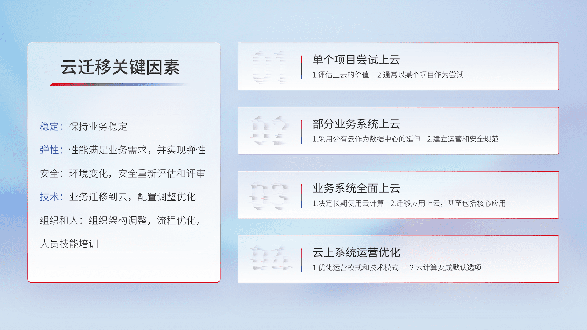 结合实际业务,,,,从规划设计、、云平台选型、、、、云原生改造、、数据迁移、、集成交付,,,迁移全过程为客户识别最佳上云路径,,,做好风险识别管理,,,设计网络架构、、、身份权限、、安全审计合规、、操作审计、、日志审计、、、监控告警策略、、多站点容灾设计等,,,对云上基础设施进行整体规划,,,提升IT治理水平,,以满足弹性、、、、高可用、、、高性能的需求。。