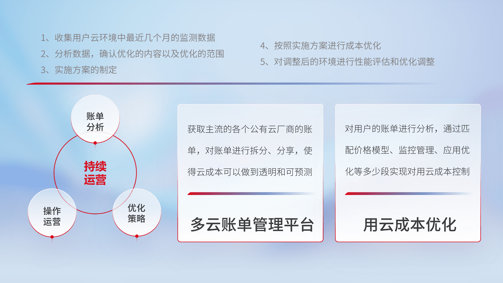 通过多云纳管,,以统一的资源数据模型把客户的云资源进行抽象和封装,,,,进而实现对多云资源的统一操作,,,保障云资源管理的可靠性、、、、稳定性与可用性。。。。量身定制化运维内容,,配置、、、、开发运维、、补丁管理、、、备份、、、、监控、、认证和访问管理、、、审计和日常巡检等,,,保障在用云过程中的可靠度,,稳定度以及高可用率。。。。