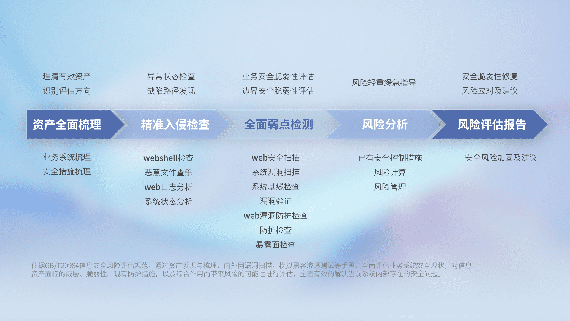 针对客户行业特性,,以专业的安全服务+多厂商联合解决方案提供专属的一站式安全管理服务,,,,帮助客户全面感知网络空间威胁,,基于识别、、、检测、、、分析、、、防护、、、、监测、、、、响应的服务理论模型,,从方案咨询、、集成交付、、、评估验证、、、优化加固、、运维运营,,,致力于为客户提供完整的闭环管理式安全服务。。。以实战经验为客户打造高抵御风险的安全体系,,帮助客户发现威胁、、对抗威胁、、、处置威胁,,,,不断积累安全对抗能力,,持续保障数字化安全。。。。
